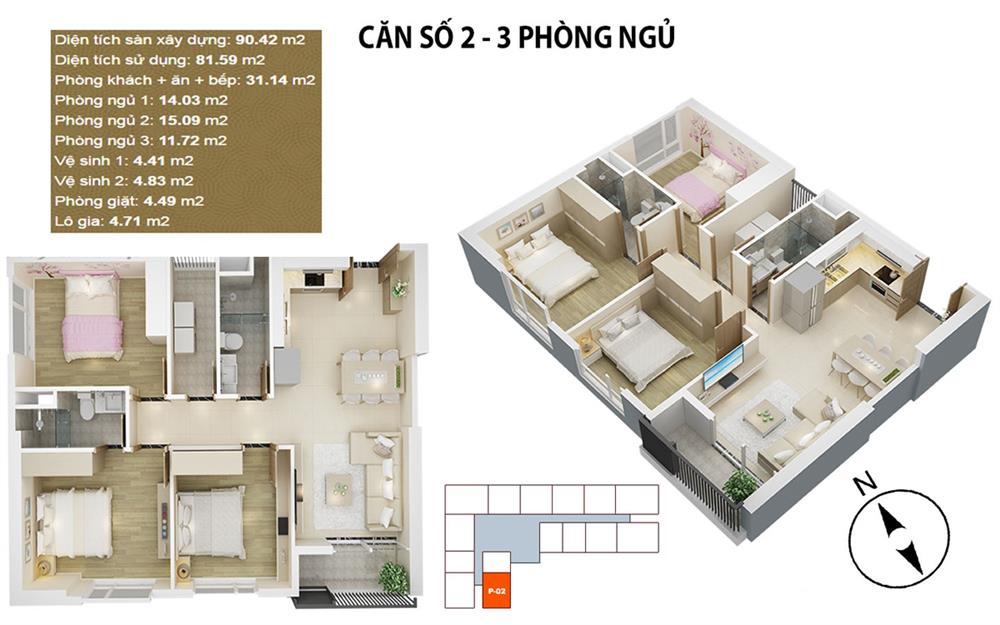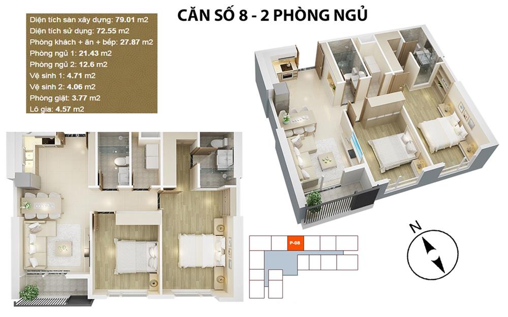 + Căn hộ 02PN: diện tích từ 79,01 – 83,99m2.