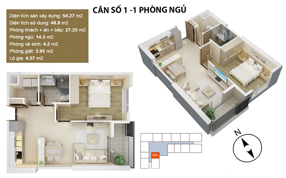 + Căn hộ 01PN: diện tích từ 53,28 – 55,77m2