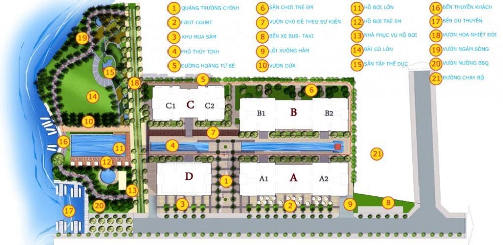 Dự án được triển khai xây dựng với diện tích rộng thì CĐT dành khoảng không gian tới hơn 8.000 m2 dành cho công viên ven sông, hồ bời; đường dạo bộ nội khu; bãi cỏ sống xanh; sân chơi dành cho trẻ em; vườn cây; khu thể dục thể thao ngoài trời riêng biệt bao gồm sân tennis; sân bóng chuyền; sân bóng rổ và sân bóng đá mini…