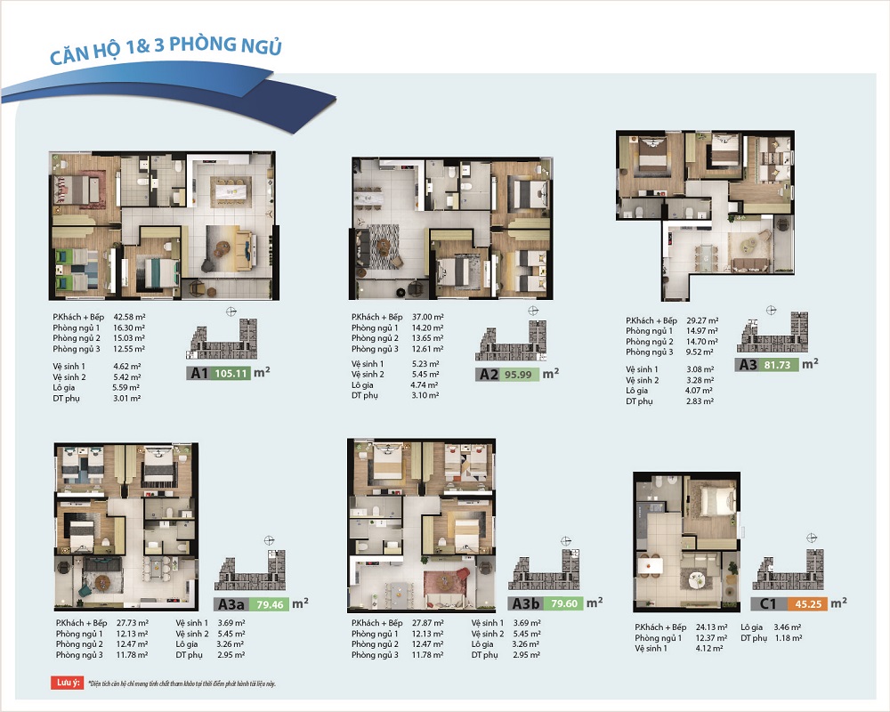 - Diện tích: Từ 46m² – 105m² (1-3 PN)