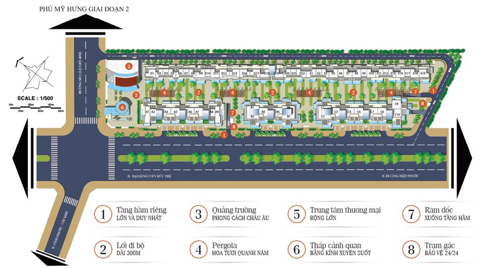 Điểm nổi bật nhất của dự án đó chính là những đường nét được thiết kế thanh lịch, tao nhã mang đậm dấu ấn, hơi thở Địa Trung Hải, các ô cửa kính cao rộng giúp đón nắng và gió tự nhiên đem lại sự giao thoa độc đáo giữa không gian sống – màu xanh của cây cối hoa lá thiên nhiên khu Nam Sài Gòn.