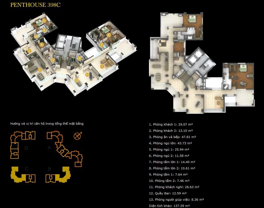 Tổng 700 căn hộ của dự án bố trí tại 10 tòa tháp căn hộ có chiều cao 23 – 28 tầng, diện tích căn hộ từ 95m2 – 398m2, cùng với đó là 1 tầng hầm giúp kết nối giữa các tháp căn hộ.