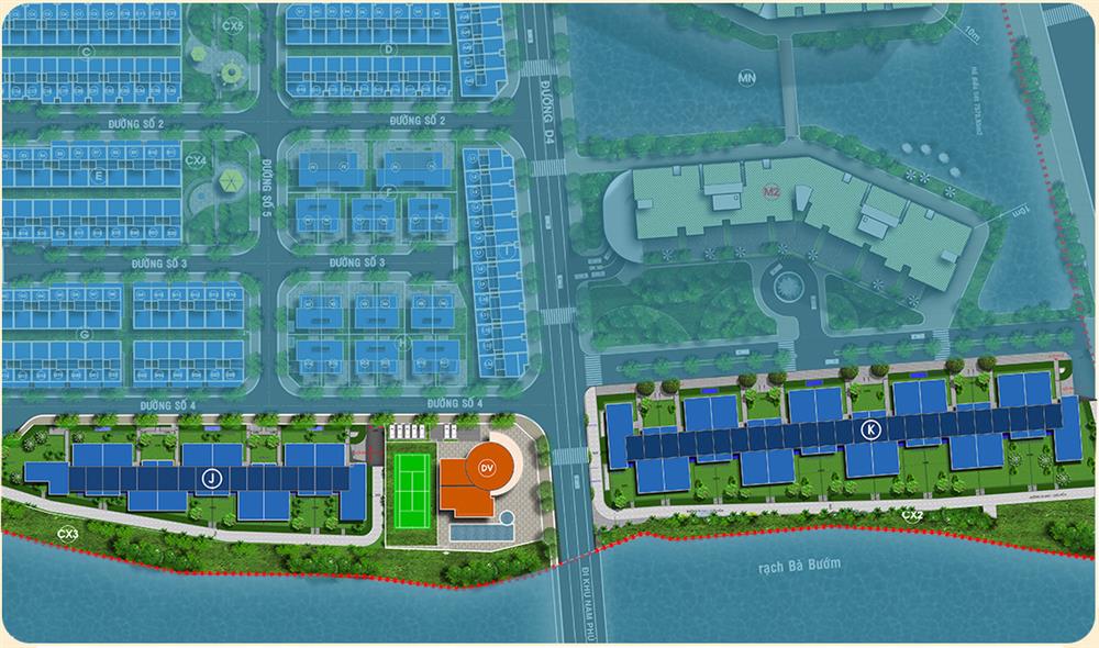 Sky villas Jamona City cung cấp các căn hộ biệt thự đẳng cấp nằm ven rạch Bà Bướm có quy mô dài hơn 700m. Vì thế mà từ dự án đã giúp đem lại tầm view nhìn đắt giá của căn hộ ra sông Sài Gòn.