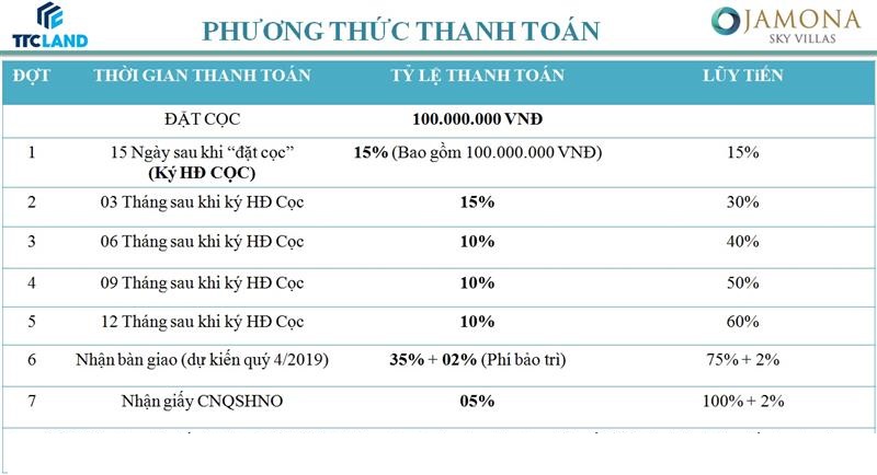 Chủ đầu tư TTC Land đã triển khai xây dựng Các dự án bất động sản Việt NamNhận được sự quan tâm hàng đầu của đông đảo khách hàng. Tại dự án căn hộ Jamona Sky Villas đưa ra thị trường mức giá bán trong khoảng từ 48 - 55 triệu đồng/m2.