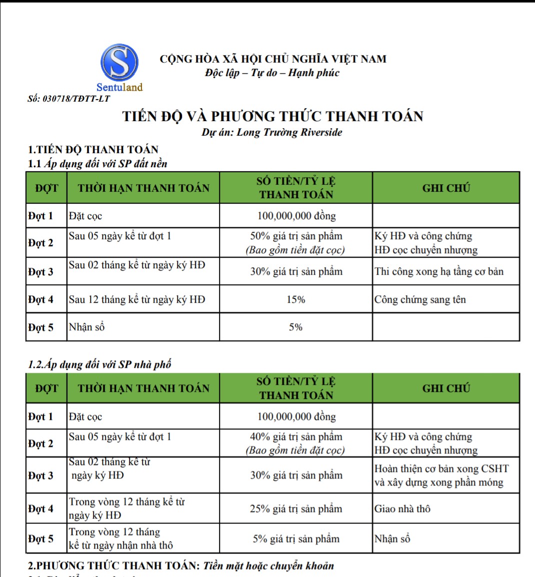 Phương thức thanh toán linh hoạt, chia thành nhiều đợt bao gồm: