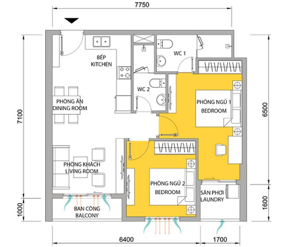 - Diện tích căn hộ: 57 – 94m2, 2-3PN