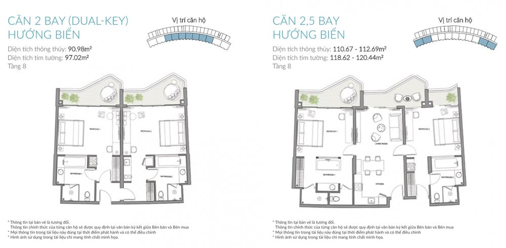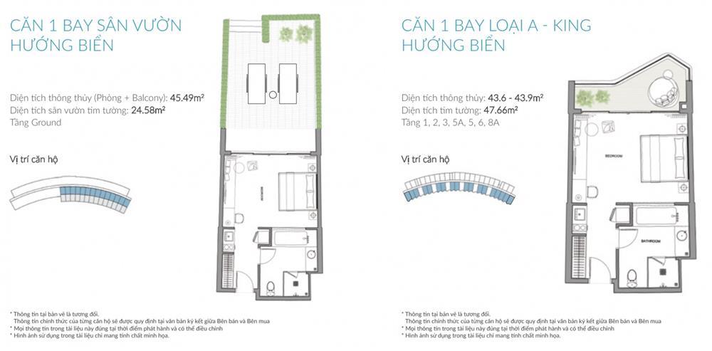 Khách hàng có thể lựa chọn các loại hình căn hộ với thiết ké 100% căn hộ hướng biển, có 2 tầng cao,diện tích như sau:
