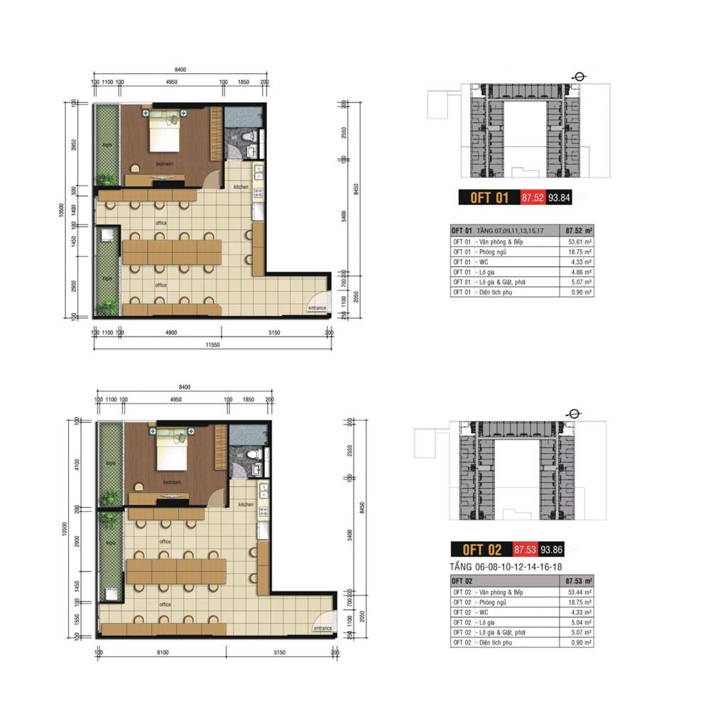 + Từ tầng 6 đến tầng 18: Căn hộ Officetel và văn phòng cho thuê (tổng diện tích sàn 31,840 m2).