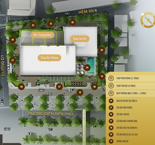 + Khối tháp 1: chiều cao 27 tầng bố trí khu văn phòng cho thuê, diện tích 42.275 m²