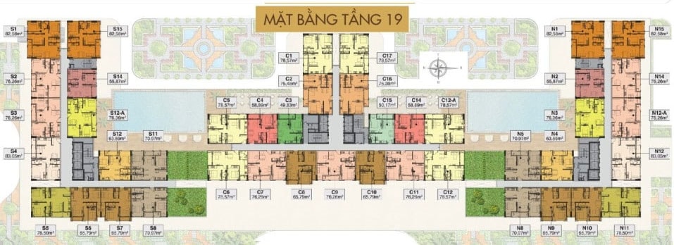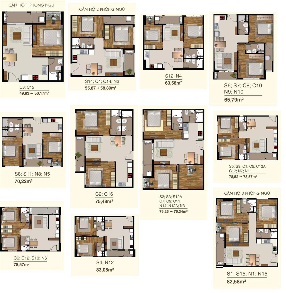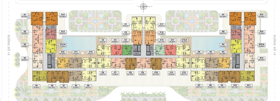 Khách hàng có thể lựa chọn các căn hộ với diện tích từ 49,83m2 – 83,05m2 tại 3 tòa tháp bao gồm: tòa tháp Southern - 22 tầng; tòa tháp Central cao 27 tầng; tòa tháp Northern cao 22 tầng.