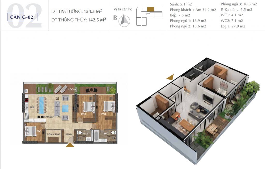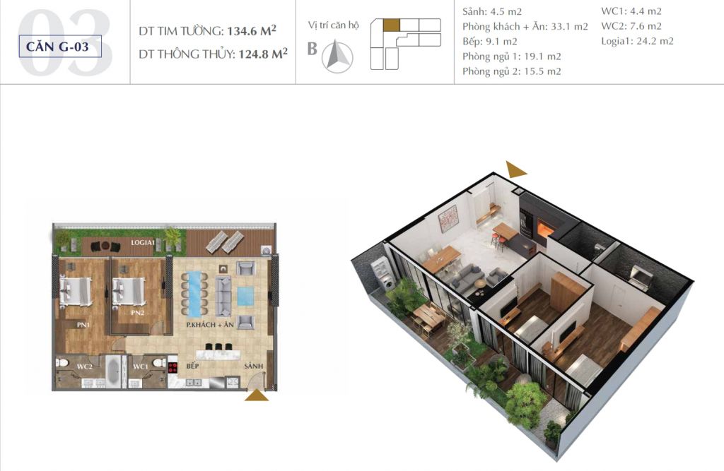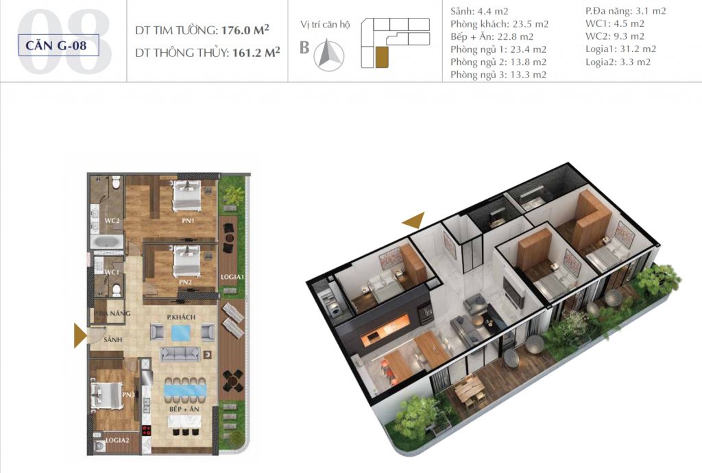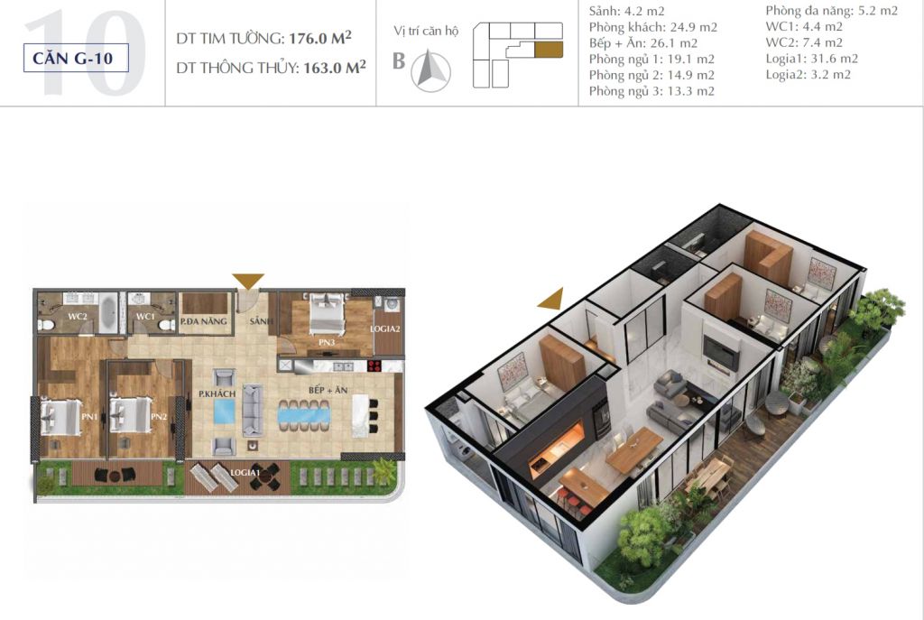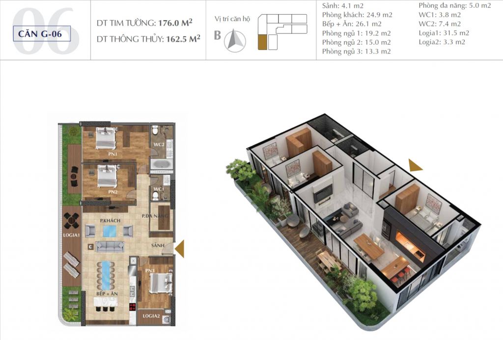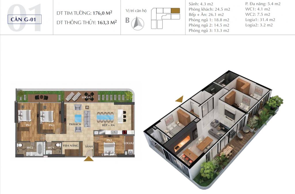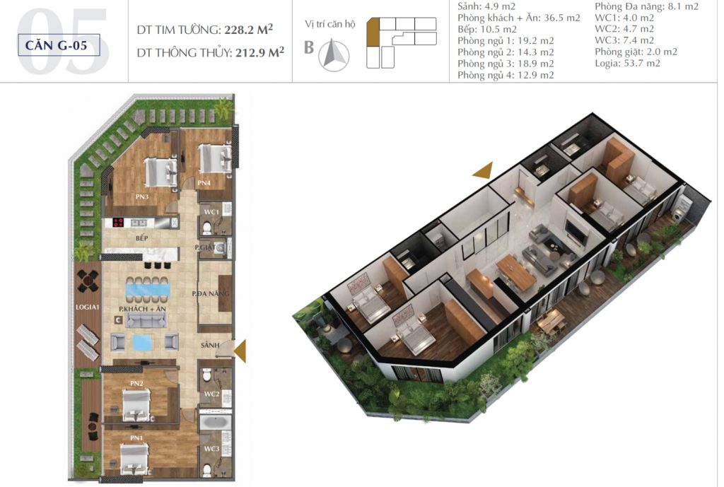 Thiết kế diện tích các căn hộ đa dạng trong khoảng từ 120m2 - 300m2. Toàn bộ dự án có mật độ xây dựng chỉ 45%, phần diện tích còn lại rất rộng lớn cho tiện ích dịch vụ, cảnh quan sống xanh.