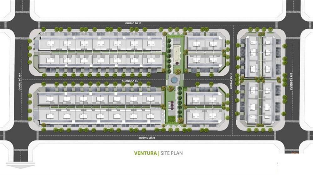 Dự án biệt thự Ventura có quy hoạch mặt bằng chi tiết bao gồm 1 trệt + 3 lầu với các loại hình biệt thự nằm tại giao lộ; biệt thự góc công viên; biệt thự điển hình.