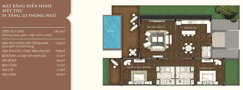 – Biệt thự từ 266.12m2, kết cấu 1 tầng 2 phòng ngủ: 729,911 USD – 823,396 USD (chưa VAT)