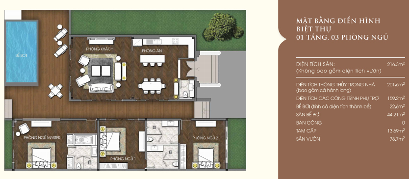 – 217 căn biệt thự 1 tầng 3 phòng ngủ, diện tích từ 375.5m2